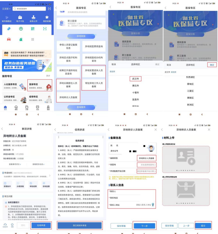 参保人下载鄂汇办app后需先注册----医保专区----异地就医-----选择备案类型-----选择参保地(参保地选择武汉市,不选区)----在线申请----阅读承诺书----为自己备案(为他人备案)----城乡居民----选择就医地、申请备案开始时间、完善联系人信息-----备案材料上传----提交备案。